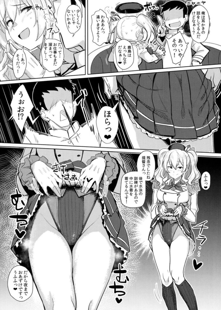 物語は鹿島が提督のエッチな誘いを断るために、インナーに競泳水着を着ていることを見せるためにスカートをたくし上げるところから始まる。競泳水着好きはもちろんそうでない人も総じて突っ込むはず。