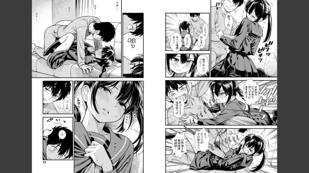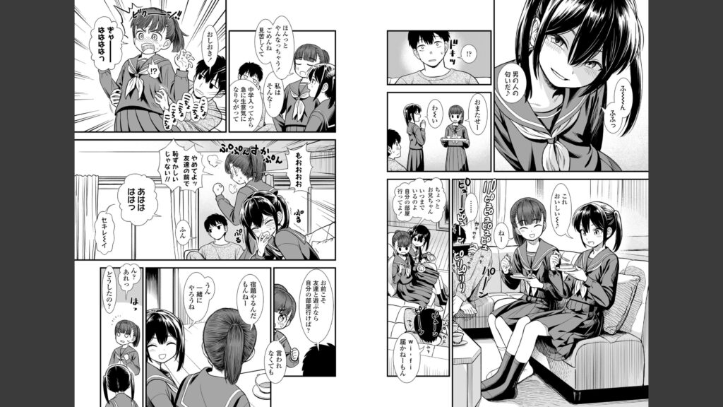 それからは妹がいてもお構いなしに自宅で行為に及び、公園の木陰で平然とクンニしたり挿入したりともはや関係を隠す気のない2人。彼女の自宅でも体を重ねて次第に仲が深まっていく。