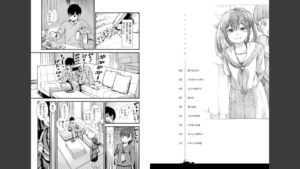 受験に失敗し、自堕落な浪人生活を送る僕の前に現れた妹の友達『セキレイ』。妹と同じく無邪気で可愛い、年相応の少女のはずだったが、触れ合うごとに顔をのぞかせる彼女の色香に、惹かれ、翻弄されていく。モノクロだった僕の夏が、にわかに色づき始めるというあらすじ。