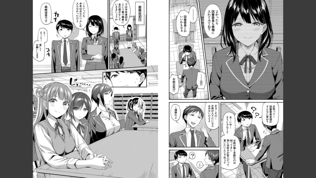 図書委員会の悪い噂の正体、それは入部した男性会員が性欲が強い女性会員の性処理担当になることだった。前任は絶倫過ぎる彼女たちに耐えられずに退会したらしい。